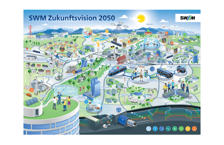 Das Big Picture der Stadtwerke München zeigt die Vision einer klimaneutralen und vernetzten Stadt der Zukunft. Es macht sichtbar, wie Energie, Mobilität und Digitalisierung zusammenspielen – verständlich erklärt und interaktiv erlebbar durch das Click Picture und eine begleitende Videoanimation.