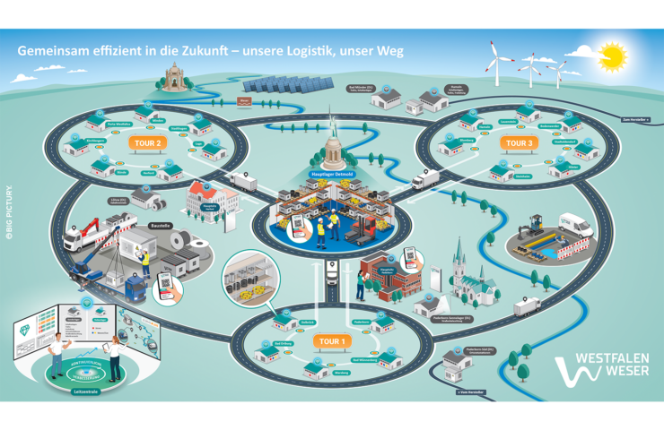 Ein Big Picture, das Klarheit in die Logistik bringt: Für Westfalen Weser entstand eine visuelle Übersicht, die Lieferrouten, Lagerstandorte, Zuständigkeiten und das neue digitale Warenbestandsmanagement auf einen Blick verständlich macht – zur Orientierung, Schulung und Prozessoptimierung im Alltag.